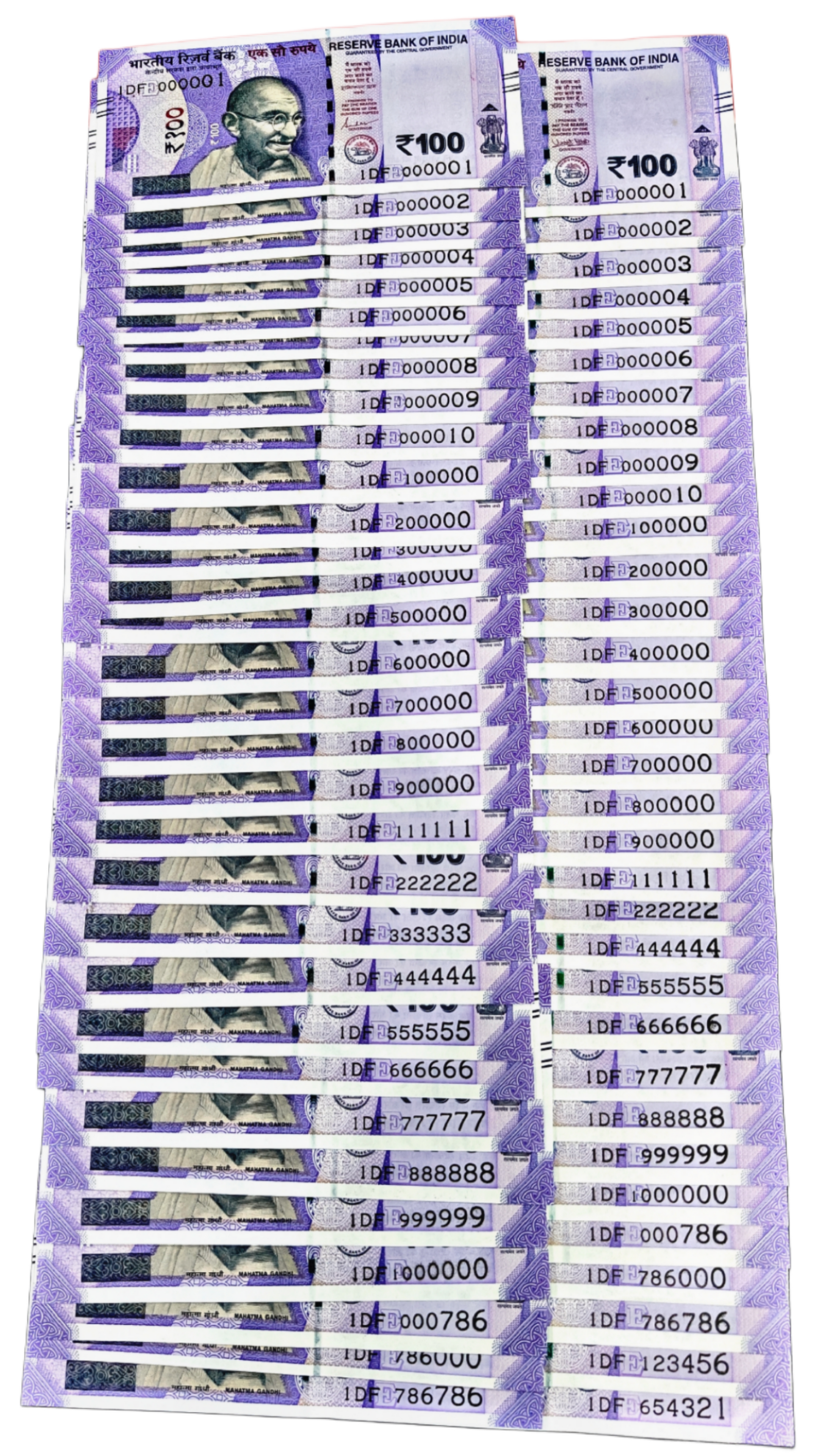 Extremely rare ₹100 note set containing 32 fancy serial numbers — including 000001, 000000, 111111, 222222, 999999 & more. Same prefix pair notes with unique patterns. A premium collectible Indian currency set.