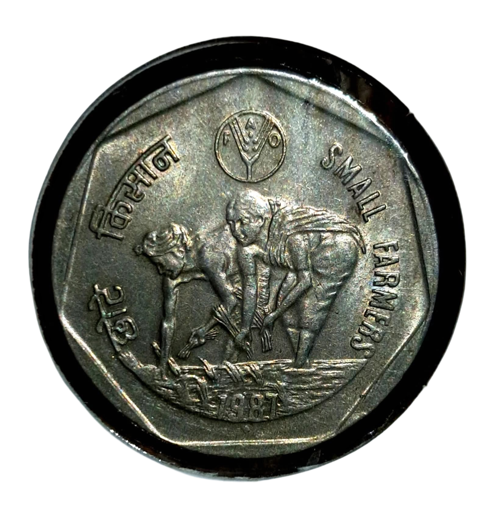 This ₹1 Coin (1987 Small Farmers Issue) is a special collectible released to honor Indian farmers under the FAO (Food and Agriculture Organization) theme. The obverse shows the Lion Capital of Ashoka with "भारत INDIA" and denomination "1 RUPEE". The reverse depicts two farmers sowing seeds with the FAO emblem, the words "छोटे किसान / SMALL FARMERS" and year 1987.